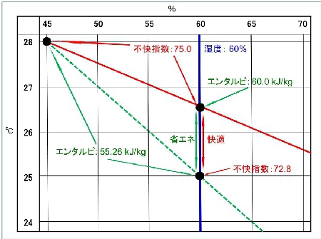 温度28℃、相対湿度45%の空気のもつエネルギー量をエンタルピーは55.3kJ/kgになる。一般に冷房をすると温度とともに湿度も下がる。つまり冷房をするということは、電気エネルギー等を使って空気のもつエネルギー量(エンタルピー)を下げることを意味する。例えば当初29℃、湿度60%(67.8kJ/kg)だった室内を、冷房で28℃、45%あるいは27.0℃、55%にすると、エンタルピーはそれぞれ55.3kJ/kg、58.5kJ/kgに下がる。この2つの温湿度の組合せでは不快指数は75で同じだが、エンタルピーを下げるために必要なエネルギーは、後者の方が約26%少なくて済む。