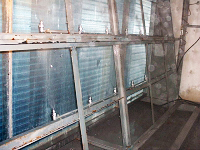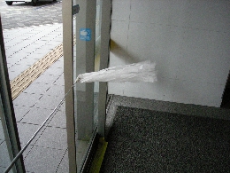 多くのビルで写真のように玄関出入口において外から内へ外気が侵入している。これは建物内が負圧になっているためで、夏季には熱い、冬季には冷たい外気が流れ込む。冬季に1階ロビーや受付等が寒い原因の多くはこの負圧のためである。