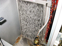 多くのビルで写真のように玄関出入口において外から内へ外気が侵入している。これは建物内が負圧になっているためで、夏季には熱い、冬季には冷たい外気が流れ込む。冬季に1階ロビーや受付等が寒い原因の多くはこの負圧のためである。